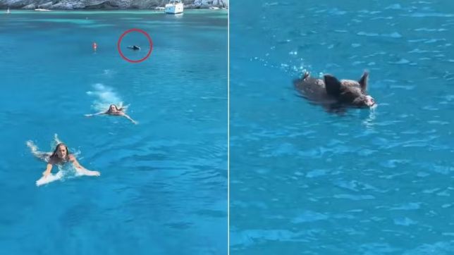 Turistas são perseguidas por javali em mar cristalino na Grécia e fogem para barco