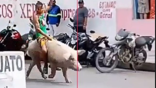 Um homem foi flagrado em cima de um porco, atravessando a rua como se estivesse imitando o personagem “Corredor” do jogo Clash Royale. Quem presenciou o momento não perdeu tempo e já começou a gravar o episódio, que arrancou risadas de quem estava por perto.