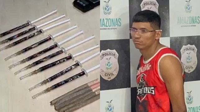 Os policiais militares localizaram e prenderam o homem identificado como Gabriel da Silva, 23, que tinha em seu poder cigarros de maconha, pedras de oxi, papelotes de cocaína e algumas seringas contendo droga injetável.