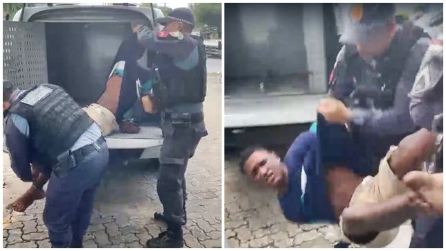 Kleber foi retirado do xadrez da viatura com as mãos e pés algemados e foi carregado para dentro da delegacia pelos policiais militares