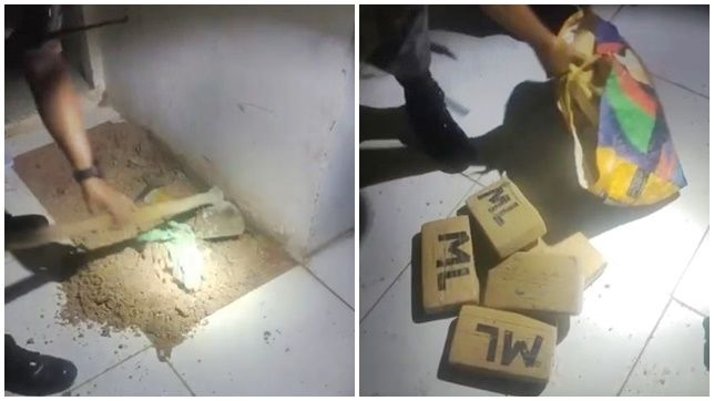 No andamento da ação, os policiais militares intensificaram buscas no interior de uma casa abandonada, onde encontraram uma bolsa que estava enterrada e contendo seis tabletes de drogas, com as características de se tratar de cloridrato de cocaína.