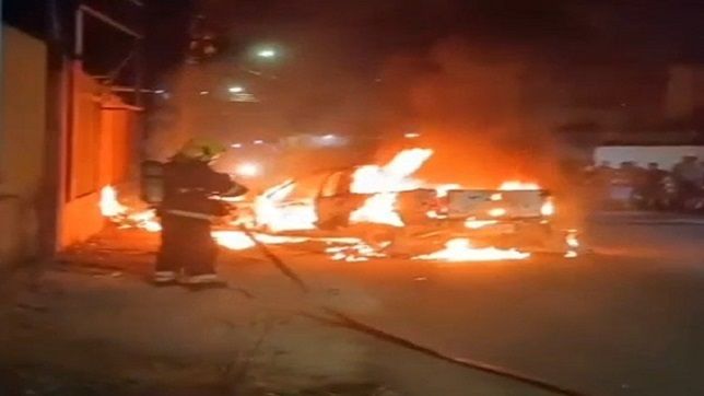 Momento que bombeiro lança jatos de água sobre o carro em chamas no início da madrugada desta sexta-feira