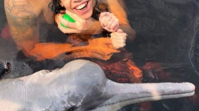 Com meio corpo submerso no Rio Negro, na Amazônia, Luiz Felipe abraça um boto cor-de-rosa e pede: "Tira foto!". O animal se deixa tocar, e o jovem sorri.