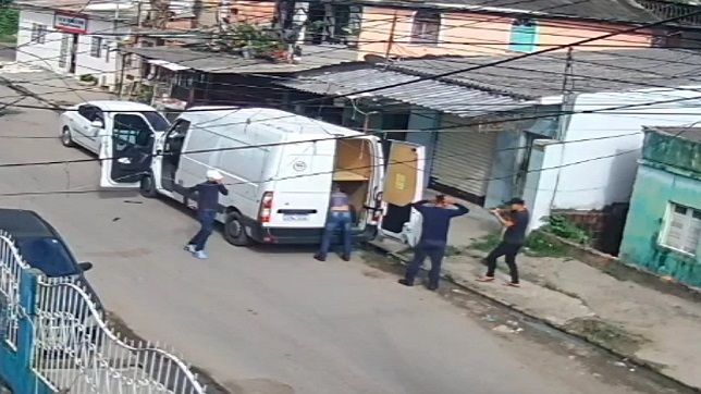 O outro trabalhador é obrigado a deitar no chão, de peito para baixo, com uma arma de fogo em sua direção e antes da fuga, ele também é obrigado a entrar no baú da Van de entrega de encomendas.
