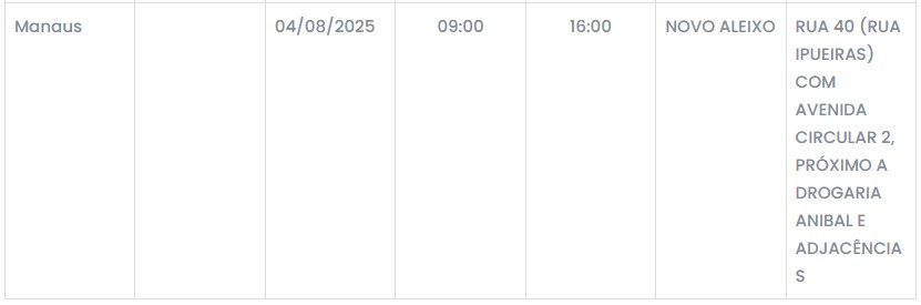 Moradores de áreas específicas dos bairros Santo Antônio, na zona oeste, e Novo Aleixo, na Zona Norte da capital amazonense, devem se preparar para uma interrupção temporária no fornecimento de energia elétrica nesta segunda-feira (4).