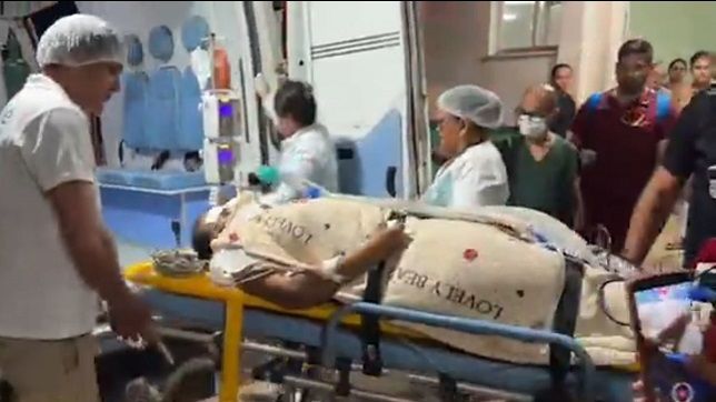 Momento que a equipe médica coloca a vítima na ambulância para ser transferida para um hospital em Manaus