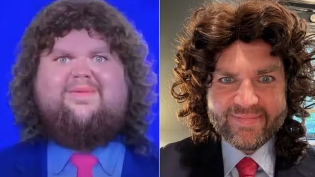 O republicano, de 41 anos, usou uma peruca castanha encaracolada e volumosa, que combinou com uma gravata vermelha e um blazer azul, numa clara imitação da versão inchada e desajeitada de si mesmo, popularmente usada por trolls da internet.