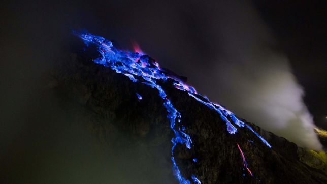 O complexo vulcânico Kawah Ijen, no leste de Java, na Indonésia, atrai visitantes do mundo todo por um fenômeno natural pouco comum: a chamada “lava azul”. O efeito é resultado da queima de gás sulfúrico, que, em contato com o oxigênio e exposto a temperaturas acima de 600?°C, produz chamas de cor intensa.